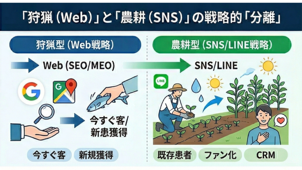 「喉が痛い」「子供が熱を出した」という切実なニーズを持つ人を確実に捕まえるのが、SEOやMEO(マップ検索)です。これは、獲物を狙う「狩猟」と同じです。 ここでは、院長の想いよりも「通いやすさ」「専門性」「口コミの安心感」が重要視されます。ここを整えるだけで、新患は自然と集まります。