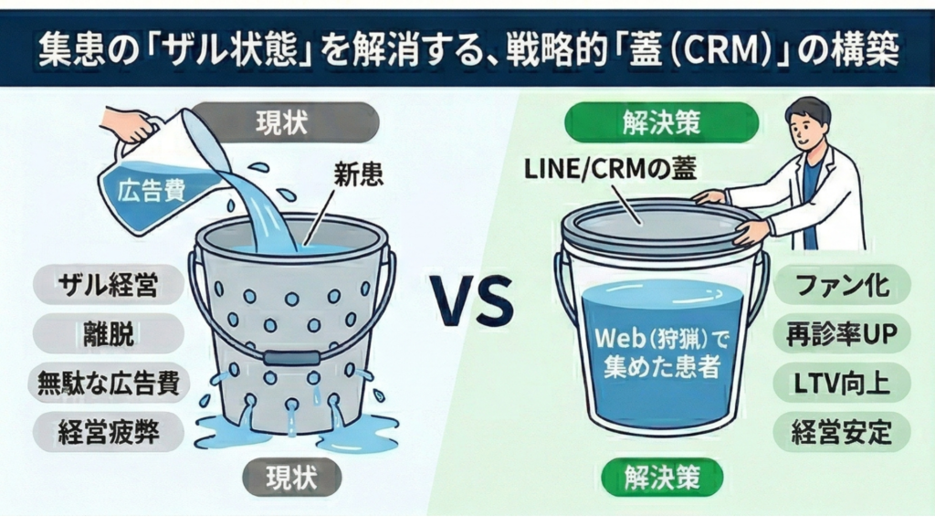 いわば、穴の開いたバケツに、一生懸命高い水(広告費)を注いでいる状態です。経営を楽にするために必要なのは、バケツを大きくすることではなく、まず「穴を塞ぐこと」なのです。