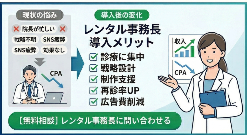 そんな風に、経営の孤独を感じてはいませんか? 事務長代行サービス「レンタル事務長さん」は、院長の「右腕」として、集患戦略の設計からクリエイティブ制作まで、実務のすべてをサポートします。